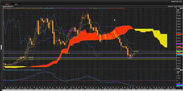 On the daily cloud chart BTC is on its way to fight the bottom end cloud chart resistance zone after rebounding from a key support zone at 17588! Now needs to break out past the 22892 and the next level of the front end of the cloud at 24982 to close back above the top end cloud chart level for a new bull rally to be confirmed. Price action above the cloud is bullish, price action below the cloud is bearish!